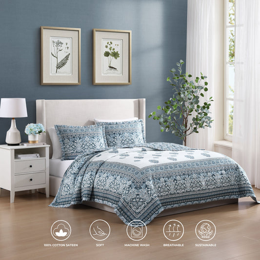 Bebejan Aquamarine Medallion 3 Piece Reversible Quilted Coverlet Set