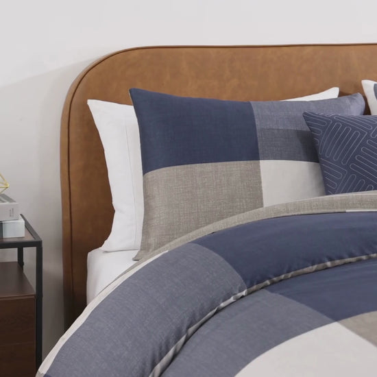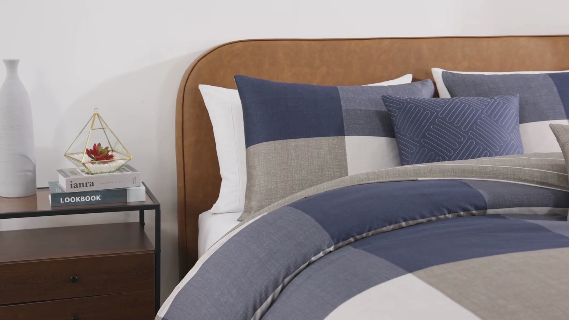 - Comforter Front: Masculine tones of navy and tan weave in and out of this printed plaid pattern